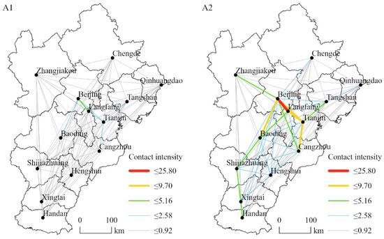 During A1, China responded quickly to cut off the transmission path of the COVID-19 pandemic by taking preventative measures, such as traffic control and extending holidays. These epidemic prevention and control policies significantly impacted the population mobility network within the BTH urban agglomeration [41]. Figure 2 shows the relative strength of the population mobility network between A1 and A2. During A1, the population mobility intensity in the BTH urban agglomeration decreased significantly. Compared with A2, the population mobility intensity between Beijing and Langfang decreased from 20.74 (first level) to 5.16 (third level). Beijing–Tianjin, Beijing–Baoding, Tianjin–Langfang, and Tianjin–Cangzhou, initially located on the second level, and Tianjin–Tangshan, which was located on the third level, all dropped to the fourth level. Other network connections initially on the third and fourth levels dropped to the fifth level, and the population mobility intensity was below 0.92. Overall, the population mobility intensity of the BTH urban agglomeration decreased by 76.3%. Beijing and Tianjin were still the core areas with high population connection intensity.