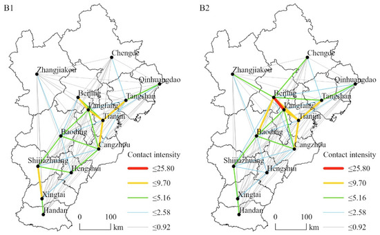 The population mobility intensity between other cities was less affected by B1. In the case of Shijiazhuang–Xingtai and Shijiazhuang–Hengshui, the population mobility intensity increased from the third and fourth levels in 2019 to the second and third levels. This shows that under the influence of the BTH coordinated development, cooperation and exchanges between the cities had improved, as well as the intensity of population mobility between cities.