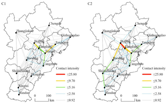 The epidemic significantly affected the population mobility network with Shijiazhuang and Beijing as the core (Figure 4). The population mobility intensity of Shijiazhuang decreased by 75.0%. Shijiazhuang–Baoding, Shijiazhuang–Xingtai, Shijiazhuang–Cangzhou, and Shijiazhuang–Hengshui all fell from the third and fourth levels to the fifth level. The population mobility intensity between Beijing and the other cities dropped by 58.8%. Among them, Beijing–Langfang dropped from the first level to the second level. Beijing–Tianjin and Beijing–Baoding dropped from the second to the third and fourth level, respectively. Beijing’s connections with Cangzhou, Chengde, and Zhangjiakou dropped from the fourth to the fifth level. Except for the four cities involved in the C1, the population mobility intensity among other cities increased by a varying degree. This shows that under the strict epidemic prevention and control measures, inter-city population mobility in unaffected areas had improved under the impetus of the BTH coordinated development.