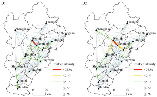During D1, the diversity of the population mobility network in the BTH urban agglomeration increased compared to D2. The average number of independent paths increased from 4.4 in D2 to 5. From the perspective of individual cities, the average number of independent paths decreased from 5.58 to 5.17 in Tianjin, while the diversity of other cities showed an upward trend. The average number of independent paths in Chengde, Zhangjiakou, and Qinhuangdao, which had low diversity, increased to 3. It can be seen that D1 had little impact on the diversity of the population mobility network. In comparison, the increase in population mobility promoted by the BTH coordinated development was more prominent in 2019–2022.