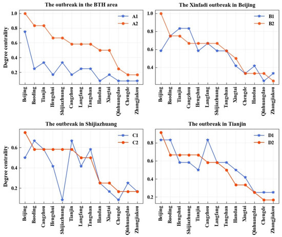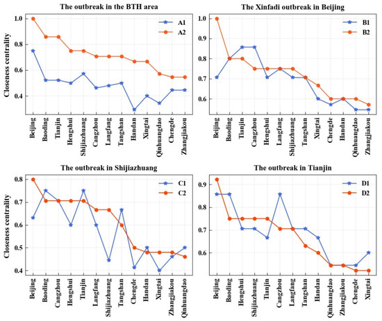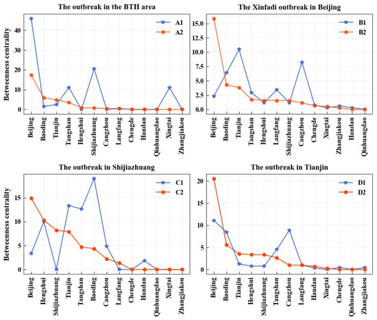 The COVID-19 epidemic also had various impacts at different stages on the cluster of population mobility networks in the BTH urban agglomeration (Table 2). The average clustering coefficient of the population mobility network in the four periods declined. The average clustering coefficient during A1 decreased from 0.84 in A2 to 0.52. The cluster of the population mobility network decreased significantly, the efficiency of resource integration also decreased. For B1, C1, and D1, the average clustering coefficient of the population mobility network of the BTH urban agglomeration decreased slightly—all decreased by 0.03, and the average clustering coefficient remained above 0.7. The network cluster effect was obvious, and the connection between cities was close. It was evident that when the population network of the BTH urban agglomeration was impacted as a whole, the cluster of the network would drop sharply. When a small number of network nodes were affected, the overall impact on the network cluster was not obvious.