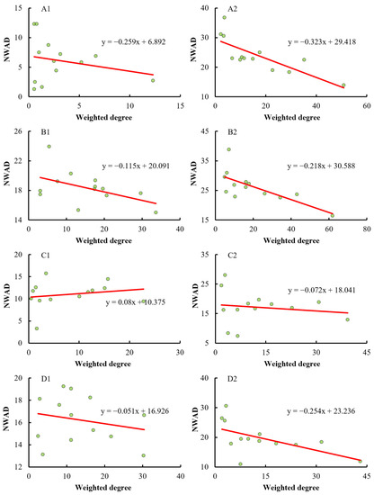 Matching of a network represents the relevance of different nodes in the network, which can be divided into assortative networks and disassortative networks. In this study, neighbor weighted average degree (NWAD) and weighted degree correlation are used to measure network matching. If the correlation coefficient of the weighted degree is positive, the network is assortative, and the cities in the network are connected at the same level. The larger the coefficient, the greater the differences in the levels of the network, and the lower the network’s resilience. If the correlation coefficient of the weighted degree is negative, the network is disassortative, and the cities in the network can be connected across levels. The larger the absolute value of the coefficient, the stronger the connection between the core cities and the marginal cities in the network, and the higher the network’s resilience. The formula can be expressed as follows:
