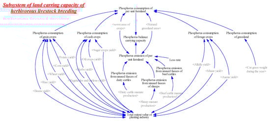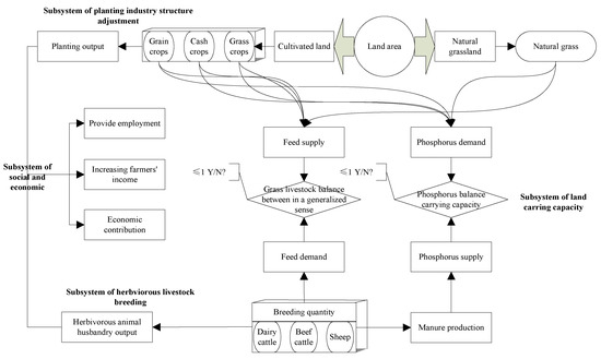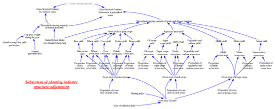 The herbivorous animal husbandry development system in the agricultural area is mainly composed of the herbivorous animal breeding subsystem, the planting industry structure adjustment subsystem, the land carrying capacity subsystem, and the socio-economic subsystem. There are interrelationships between the various subsystems and the internal elements of the subsystems. The main relationship between the subsystems is shown in Figure 2.