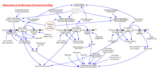 The herbivorous animal husbandry system’s production process can theoretically include four levels, namely pre-primary production, primary production, secondary production and post-secondary production. In the process of reproduction, it is full of the interweaving of natural reproduction processes and economic reproduction processes; therefore, the herbivorous animal husbandry system is a large complex system with wide extension and deep connotation. There are many components of the complex system, and the interconnection between various components is both causal and complex, and not all of them are linearly related. Therefore, herbivorous animal husbandry systems are characterized by high order (multiple state variables), nonlinearity and multiple feedback (multiple elements are mutually causal). To complete the study of such large systems, the functional models developed by general quantitative methods cannot reveal the characteristics of the internal structure of the system. The importance of the system structure is that it can determine the function of the system; therefore, only the structure–function model may reveal the causes and processes of system changes. The herbivorous animal husbandry system dynamics model, precisely from the structural analysis of complex systems, establishes a structure–function model with high-order, multi-loop and non-linear characteristics, through the overall operation of the model, in order to demonstrate the dynamic process of system development, reveal the dynamics and obstacles of the development process, and propose ways and methods to improve the system behavior.