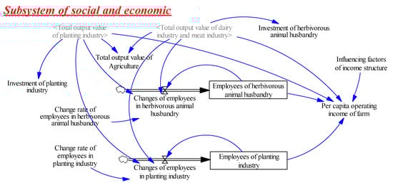 Through searching literature, it is found that herbivorous animal husbandry is a product of economic and social development stages [20]. Existing research is mostly qualitative, or a single system, even though multiple systems fail to achieve dynamic feedback between systems. According to the theory of grassland agriculture, compared with traditional agriculture, the herbivorous animal husbandry system has obvious economic and ecological attributes, economically guarantees higher biological yields, and ecologically emphasizes the cycle and feedback between plants and animals, that is grass-livestock integrated and a combination of planting-breeding [21]. Therefore, the production process of herbivorous animal husbandry in agricultural areas is full of the interweaving of the natural reproduction process and economic reproduction process. In such a system, there are many elements and different attributes [22]. The interrelationships among the various constituent elements are both causal and complex, and they are not all linearly related. Therefore, the herbivorous animal husbandry system has the characteristics of high-order (multiple state variables), non-linearity, and multiple feedback (multiple elements are causal to each other). Although the traditional econometric model can capture the basic dynamic characteristics of each element through parameters, if the element attributes are different, the model cannot be expressed completely, and an error in the estimation result can be obtained [23]. Only the structure–function model can reveal the causes and processes of system changes [24].