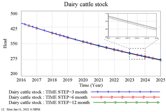 - Dairy cattle stock = INTEG (Increase in dairy cattle stock-dairy cattle culling, 444). Units: head.