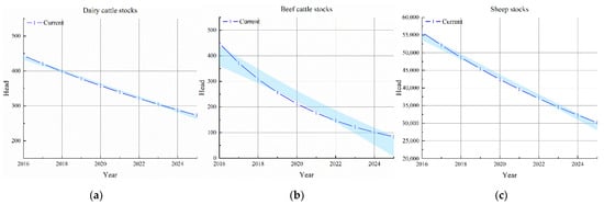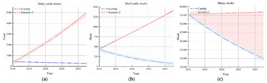 The output of simulation results of dairy cattle, beef cattle, and mutton sheep stocks under scenario 2. (a) Dairy cattle stock; (b) beef cattle stocks; (c) sheep stocks.
