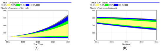 It is an important step in the optimization of the system dynamics model to find out the sensitive factors in the model that have a greater impact on the system through the system parameter sensitivity analysis. Using VENSIM DSS software, take the group stock of dairy cattle as an example to conduct Monte Carlo sensitivity analysis. The group stock of dairy cattle is essentially determined by the basic cows, and the number of basic cows is affected by two key variables, the rate of death and elimination, and additional project investment. As shown in Figure 12, the manifestation in the software is that all the results fall into the gray area (yellow + blue + green + gray). The larger the gray area, the more sensitive the variable is. In 200 simulations of the two variables that affect the rate of dead scouring and additional investment, it is found that the key factors affecting the number of basic cows of dairy cattle are more reflected in the rate of death and elimination. For additional investment projects, in the absence of additional investment, even if all of the field‘s funds are invested in dairy projects, it cannot change the trend of decline in inventory. Therefore, in terms of system optimization, according to the effectiveness of the strategy, we can give priority to the optimization and adjustment of the death and elimination rate, and for the problem of insufficient private capital, we can consider additional investment through other financing channels to meet the problem of insufficient production capacity. Similarly, according to this method, the key factors affecting the stock of other livestock can be obtained.