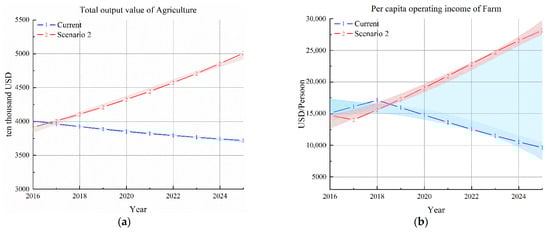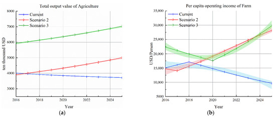Simulation results of total agricultural output value and per capita income under scenario 2. (a) Total output value of agriculture; (b) per capita operating income of farm.