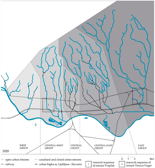 All genesis phases of Zagreb’s stream system indicate that the central urban area hosts the sites of the most intense urban pressure where urban streams are transmuted into grey infrastructure and where the continuity of Zagreb’s blue infrastructure is interrupted (Figure 3).