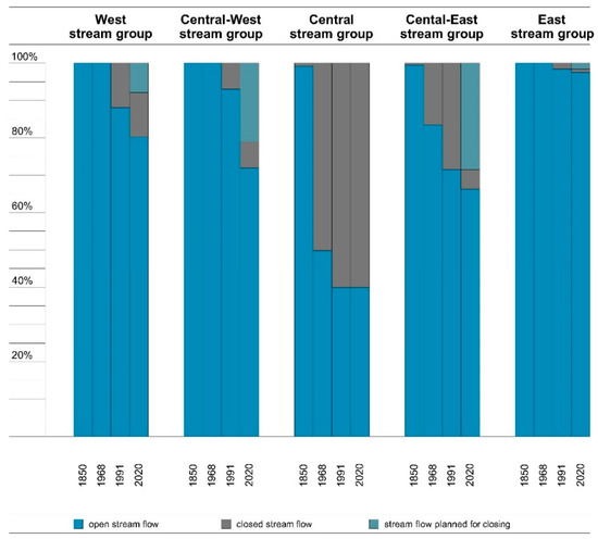 Zagreb’s stream system is divided into five (5) spatial and functional groups, the West, Central-West, Central, Central-East, and East group (Figure 1), to enable a quantitative tracking of stream landscape change. A graphic interpretation of the genesis of Zagreb’s stream system is created by superimposing spatial data from the available cartographic sources for the period from 1850 to 2020 (Figure 2). It demonstrates the most significant changes evident in stream closing, channeling and diverting interventions which are measured (length) and compared in ratio for each spatial group and for each genesis phase (Figure 3).