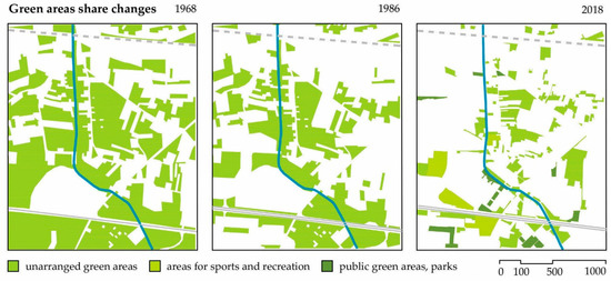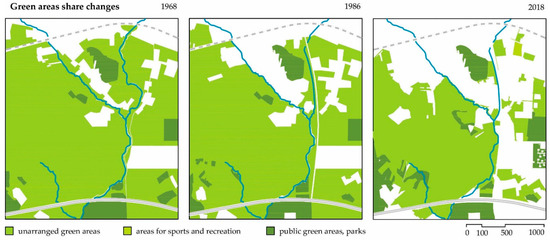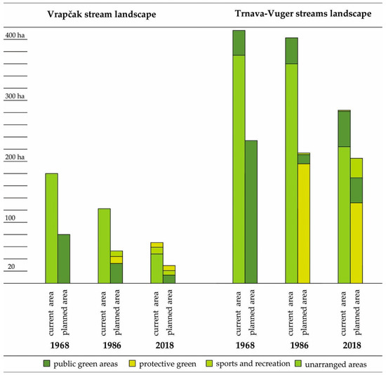Quantitative changes in the urban landscape were determined by objectively measuring greenness and expressed in the percentage area of green [63]. A total share of all existing (realized) and planned green spaces is graphically and numerically represented for each analyzed period.