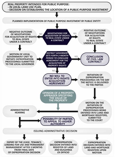 Many authors point to the fact that compensation for expropriated real estate should correspond to its market value [13,14], though this is not always the same as fair compensation [6,15,16]. In postcommunist countries, these include forced land seizures performed by the state in the past without due compensation [17,18]. Another reason is that the interests of the expropriated are not fully taken into account. On the other hand, in countries where the state has abused its position in the past, as in postcommunist countries, expropriations are currently carried out in a complicated, multistage procedure (Figure 1).