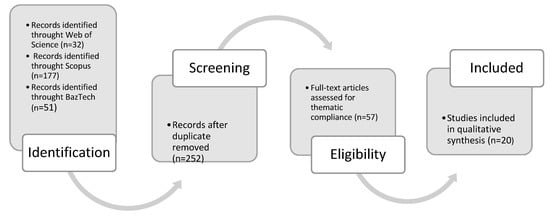 Following [67,68], the Scopus, Web of Science, and Polish BazTech databases were reviewed by searching for publications in international databases using the following keywords: expropriation, compensation, and Poland, because it is the procedure used in Poland that is the subject of the analysis. Figure 3 illustrates the method for selecting publications containing information on the procedure for determining compensation for expropriated real estate.