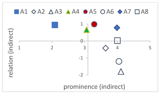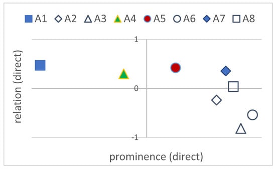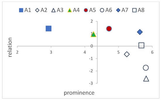 The results of calculations for the full set of eight factors are presented in several figures. Matrix X is obtained by means of Equation (1). Figure 4 deals with cases of direct influence. The prominence and the relation indices were obtained by means of Equations (10) and (11), respectively. Figure 5 was obtained for the case of indirect-influence-related indices—Equations (12) and (13). Finally, results for the total influence case are presented in Figure 6, where the prominence and the relation indices result from Equations (8) and (9), respectively.