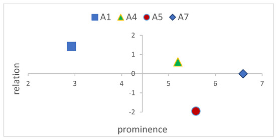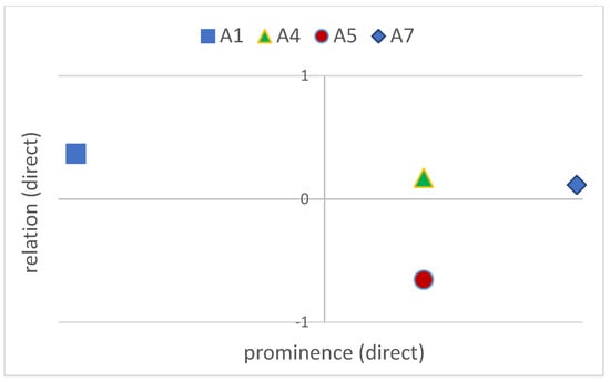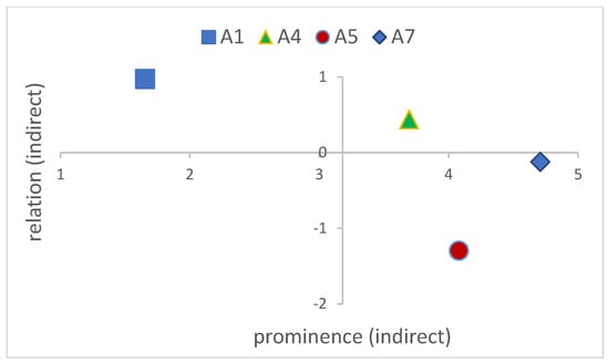 The second stage of the DEMATEL technique application was devoted to the set of four factors which proved to be the only evident causes in the full factor set case, namely: A1, A5, A4, and A7. The results of the calculations are presented in Figure 7, Figure 8 and Figure 9. They correspond to the cases of direct, indirect, and total influence, respectively.