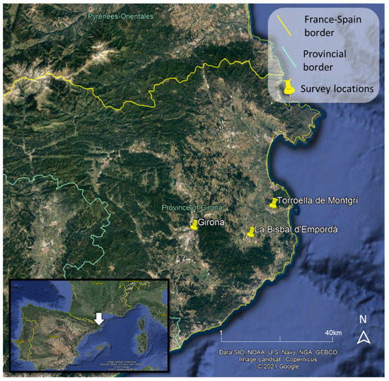 The assessment was carried out in three municipalities in the province of Girona (Catalonia, Spain) (see Figure 1) where the Fireflocks project sites and the labeling initiative for meat and dairy products from herds contributing to wildfire risk prevention was taking place. We selected three different municipalities with big, medium and small size to encompass the heterogeneity in consumer preferences that may arise from contrasting urban and rural towns. The city of Girona is the capital of the province (101,932 inhabitants), while Torroella is a big town (12,023 inhabitants) and La Bisbal is a small village (11,190 inhabitants) [35]. The survey was conducted in the study area before commercializing meat products with the project label as a pilot test.