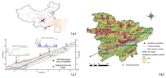 Rainfall-induced landslides, which are characterized by large masses, instantaneous sliding, and as violent, are one of the main types of geological disasters in the world [,,]. For instance, Wasowski [] indicates that the expansion of Caramanico Terme in this century has led to the urbanization of marginally stable valley slopes, and recent landslides were caused by heavy precipitation (antecedent moisture was a more critical factor than the amount of storm rainfall). Later, Kristo [] predicted the effects of rainfall process changes on landslides in Singapore and found that climate change would result in increased rainfall intensity and duration. Recently, Lukić [] studied the erosivity classes of rainfall-triggered landslides, especially for 2010 and 2011 on the northern outskirts of Belgrade. In this area, surface water runoff was directed into the porous loess, thereby endangering slope stability. He [] defines four groups of rainfall thresholds at different quantile levels based on 771 landslide events that occurred in China during 1998–2017. It was found that extreme rainfall events caused by climate change would increase the probability of landslides in China. Statistically, most of the main landslides that have occurred in southwest China over the past 40 years were caused by rainfall []. Hence, landslide deformation monitoring data provide important information for early warnings regarding various landslide risks and for uncovering the key moments of landslide events for their prevention and control [,,]. However, because landslides characteristically accumulate deformation slowly and occur instantaneously, it is difficult to achieve a forward-looking landslide risk warning system through only deformation monitoring data; accordingly, the development of additional early warning methods is urgent.