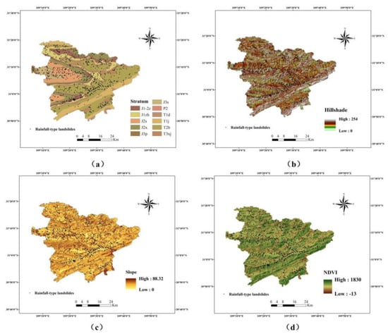 Thematic maps in Fengjie of physical properties about landslides. (a) Stratum. (b) Hill shade. (c) Slope. (d) NDVI.
