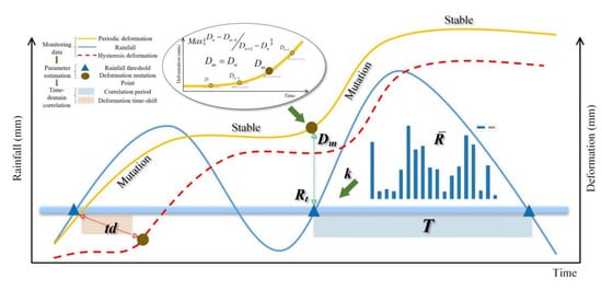 To quantify the time-correlation characteristics between regional rainfall and landslide deformation, the time-domain correlation measurements are proposed for the above phenomenon, including the correlation period and deformation time shift. The monitoring data characteristics are estimated to obtain the quantitative description of the above correlation measurements: the rainfall threshold , the mutation point in deformation process . The conceptual model is illustrated in Figure 3.