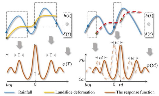 However, it is quite difficult to calculate the abovementioned rainfall critical value and landslide mutation point by partitioning the rainfall history curve into multiple processes. At the same time, the monitoring data of a complex sequence cannot be satisfied due to signal noise, a delay in the response, and other problems. To accurately fit the correlation measurement of landslides affected by a long time sequence of rainfall in reality, the impulse response function is introduced during signal processing to calculate the correlation function between the two signal sequences and measure the similarity between the two signals, thereby realizing inversion from geometric distance to the actual time interval [,].