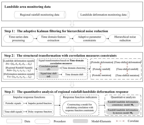 This paper uses signal processing technology to quantitatively measure the correlation between regional rainfall and landslide deformation. The flow chart of the method is illustrated in the Figure 5. The core steps are as follows: ① Considering the presence of noise in landslide deformation monitoring data, the proposed method is based on the described time-domain correlation measurement and parameter extraction of the change characteristics of rainfall data and deformation data; this approach adopts an adaptive variable-parameter constrained time-domain classification method for Kalman filtering. ② Due to the unsynchronized time-domain correlation characteristics between rainfall and deformation in landslide disasters, combined with the abovementioned correlation measure, the correlation between the period and time shift of the monitoring signal transformation structure is realized after noise reduction. ③ An impulse response function that can fuse two or more signal time-domain change characteristics is constructed, and the deformation time series variable is calculated in response to the consistent correlation and goodness of fit of the rainfall variables. ④ The correlation model of the rainfall-induced landslide deformation response in combination with the above quantitative factors is analyzed, and then the nature of the internal factors is verified; finally, the correlation period between regional rainfall and landslide deformation (the lag time) is quantitatively measured.
