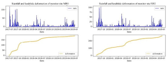 The landslide deformation data and regional rainfall data were obtained from 2017 to 2020 at the Fengjie monitoring network, provided by the Chongqing Planning and Natural Resources Bureau. The landslide deformation is monitored by GNSS (monitoring instruments are installed at the monitoring points described in Table 1) instruments on an hourly time scale, and consists of vertical and horizontal deformation. The time interval is an hour, the rainfall is recorded in an hourly increment by a tipping bucket, and the data are unified in time sequences with a unit of days during data preprocessing.