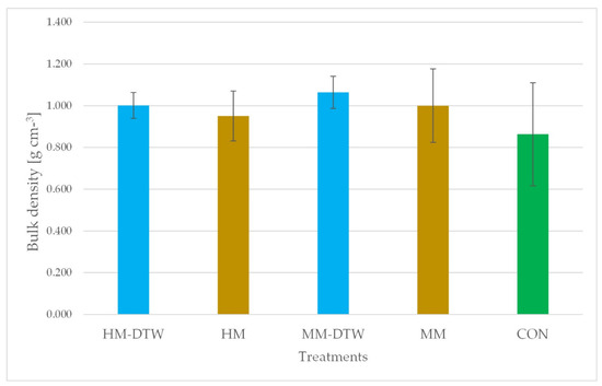 Bulk density for the different treatments. Obtained p-value from ANOVA was p = 0.37 (HM-DTW—areas identified as sensitive by DTW algorithm and harvested with high mechanisation level; HM—areas not identified as sensitive by DTW algorithm and harvested with high mechanisation level; MM-DTW—areas identified as sensitive by DTW algorithm and harvested with medium mechanisation level; MM—areas not identified as sensitive by DTW algorithm and harvested with medium mechanisation level; CON—control area consisting of unharvested oak coppice in the last 20 years located close to the two parcels).