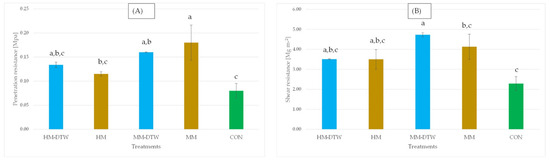 Penetration resistance (A) and shear resistance (B) for the different treatments. Obtained p-values from ANOVA were p = 0.00041 for penetration resistance and p = 0.00012 for shear resistance. Different letters indicate homogeneous groups (p < 0.05) according to HSD Tukey test (HM-DTW—areas identified as sensitive by DTW algorithm and harvested with high mechanisation level; HM—areas not identified as sensitive by DTW algorithm and harvested with high mechanisation level; MM-DTW—areas identified as sensitive by DTW algorithm and harvested with medium mechanisation level; MM—areas not identified as sensitive by DTW algorithm and harvested with medium mechanisation level; CON—control area consisting of unharvested oak coppice in the last 20 years located close to the two parcels). Different lowercase letters indicate different homogeneous groups at p < 0.05 according HSD Tukey Test.