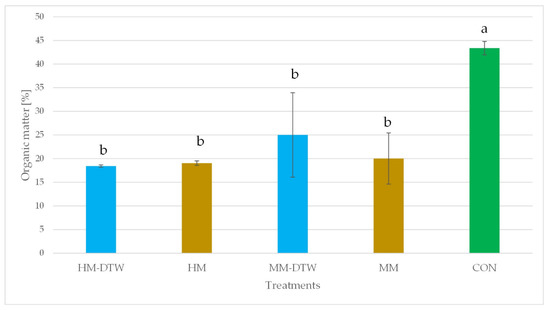 Organic matter for the different treatments. Obtained p-value from ANOVA was p = 0.00001. Different letters indicate homogeneous groups (p < 0.05) according to HSD Tukey test (HM-DTW—areas identified as sensitive by DTW algorithm and harvested with high mechanisation level; HM—areas not identified as sensitive by DTW algorithm and harvested with high mechanisation level; MM-DTW—areas identified as sensitive by DTW algorithm and harvested with medium mechanisation level; MM—areas not identified as sensitive by DTW algorithm and harvested with medium mechanisation level; CON—control area consisting of unharvested oak coppice in the last 20 years located close to the two parcels). Different lowercase letters indicate different homogeneous groups at p < 0.05 according HSD Tukey Test.