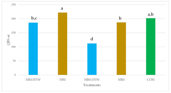 QBS-ar index for the different treatments. Obtained p-value from Kruskal–Wallis test was p = 0.0013. Different letters indicate homogeneous groups (p < 0.05) according to Duncan test (HM-DTW—areas identified as sensitive by DTW algorithm and harvested with high mechanisation level; HM—areas not identified as sensitive by DTW algorithm and harvested with high mechanisation level; MM-DTW—areas identified as sensitive by DTW algorithm and harvested with medium mechanisation level; MM—areas not identified as sensitive by DTW algorithm and harvested with medium mechanisation level; CON—control area consisting of unharvested oak coppice in the last 20 years located close to the two parcels). Different lowercase letters indicate different homogeneous groups at p < 0.05 according HSD Tukey Test.