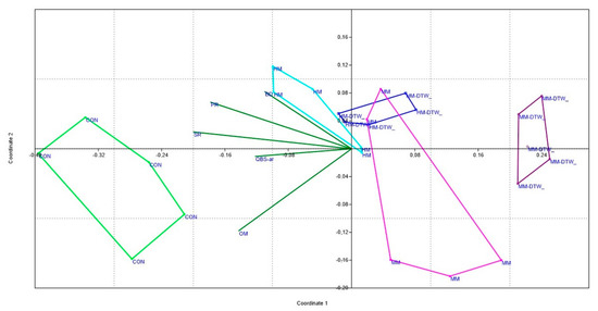 Non-metric multidimensional scaling (nMDS) analysis of the main indexes and indicators of the disturbed soil and the control (BD—bulk density; PR—penetration resistance; SR—shear resistance; OM—organic matter; QBS-ar—soil biological quality based on microarthropods soil biological quality) (HM-DTW—areas identified as sensitive by DTW algorithm and harvested with high mechanisation level; HM—areas not identified as sensitive by DTW algorithm and harvested with high mechanisation level; MM-DTW—areas identified as sensitive by DTW algorithm and harvested with medium mechanisation level; MM—areas not identified as sensitive by DTW algorithm and harvested with medium mechanisation level; CON—control area consisting of unharvested oak coppice in the last 20 years located close to the two parcels).