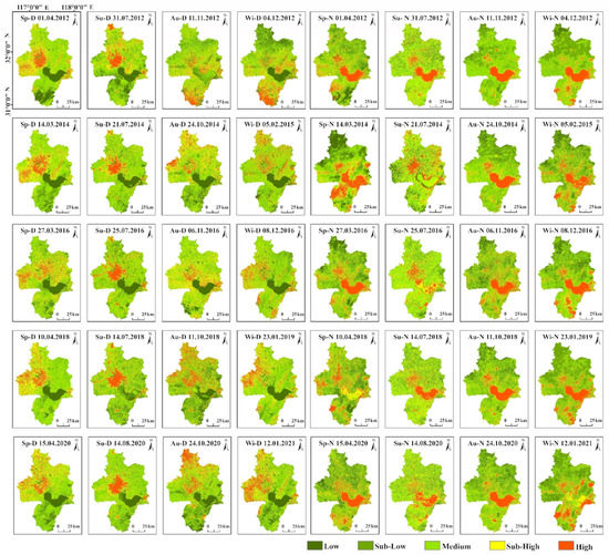 Figure 3 shows the day and night SUHI images of Hefei during the different seasons from 2011 to 2020. The fused Landsat images presented more detailed information (e.g., image texture structure) and clearer boundaries than the MODIS images. The urban heat island phenomenon occurs in spring and summer during the day and becomes more obvious in summer, whereas the SUHI in other seasons is not obvious. Apparently, SUHI has been concentrated in the main city zone of Hefei over the past 10 years. The built-up areas of Changfeng, Chaohu, and Lujiang were small, and the effect of SUHI was not prominent. Heat islands appear on cultivated land during the spring, autumn, and winter. Because part of the cultivated land is not cultivated during these seasons, the surface of the land is exposed and rapidly heated by solar radiation. Thus, the surface temperature was higher. An urban heat island exists in all seasons at night, which is relatively evident in spring and summer. In addition, a heat island also appears in water bodies at night, mainly because the larger specific heat capacity of the water area slows down the cooling rate at night and, hence, increases the temperature. The temperature at night in areas covered by vegetation during winter was relatively high. Owing to the high thermal inertia of vegetation, dense vegetation has a heat preservation effect at night, and the temperature is higher than in other areas [54].