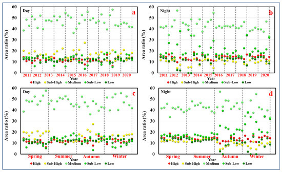 The area ratio of each temperature level zone from 2011 to 2020 ((a,b) are the area ratios of temperature zones during daytime and nighttime in different years, respectively; (c,d) are the area ratios of temperature zones during daytime and nighttime in different seasons, respectively).
