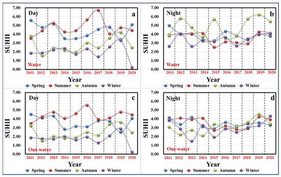 Diurnal and seasonal SUHII of Hefei from 2011 to 2020 ((a,b) are the SUHII during daytime and nighttime in different years, respectively; (c,d) are the SUHII during daytime and nighttime in different years under the excluded water, respectively).