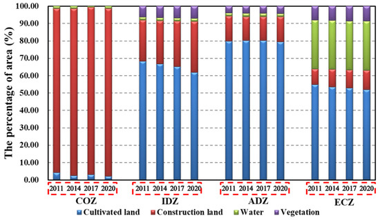 For the entire study area, with the increasing urbanization process, the cultivated land occupied by construction land decreased from 2011 to 2020. This may have led to the occupation of agricultural water. Water and vegetation were relatively stable, with little change. The four MFOZs showed significant differences in terms of area and landscape composition. The ratios of the four MFOZs (COZ, IDZ, ADZ, and ECZ) in Hefei were 1%, 46%, 28%, and 25%, respectively (Figure 6). The level of urbanization rapidly decreased from the COZ to the ECZ. Although only 0.01% of the study area is covered, according to Hefei’s MFOZ planning (2016–2020), the development intensity of the COZ is more than 90%, with approximately 6700 people per square kilometer, which is between five and ten times the average level of the whole city. From 2011 to 2020, construction land was dominant in the COZ, accounting for more than 94% of the area. In the IDZ, the main landscape is cultivated land, which accounts for more than 61% of the study area. Construction land was another important component of the IDZ, accounting for more than 23% of the total. Cultivated land accounted for approximately 80% of the ADZ, whereas construction land accounted for approximately 14%. The ECZ had the lowest level of urbanization among the four MFOZs. The coverage rates of cultivated land, construction land, water, and vegetation were approximately 53%, 9%, 28%, and 8%, respectively.