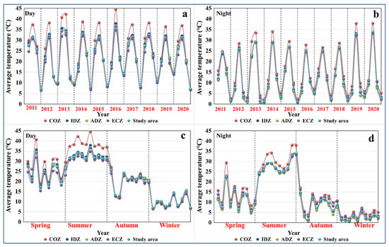 The average LST of MFOZ from 2011 to 2020 ((a,b) are the average temperature of MFOZ during daytime and nighttime in different years, respectively; (c,d) are the average temperature of MFOZ during daytime and nighttime in different seasons, respectively).