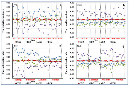 The CI of the MFOZ to the urban thermal environment from 2011 to 2020 ((a,b) are the CI of MFOZ during daytime and nighttime in different years, respectively; (c,d) are the CI of MFOZ during daytime and nighttime in different seasons, respectively).