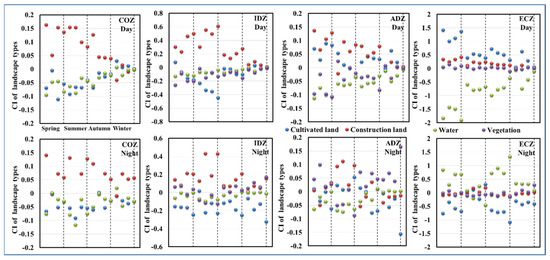 In the IDZ, regardless of the time of day, construction land played a positive role in the regional thermal environment in all seasons. In particular, construction land contributed the most to the summer regional thermal environment during the daytime, at 0.61. At the same time, the average LST of construction land is more than 0.24 °C higher than the regional average LST. Cultivated land, vegetation, and water play negative roles during the day, particularly in spring and summer. At night, cultivated land played a negative role, and the CI of water and vegetation fluctuated around zero. Cultivated land, vegetation, and water can alleviate this regional thermal environment. The three landscape types have similar contributions to the urban thermal environment, but there are some differences. Because cultivated land is lush in summer and accounts for more than 61% of the area, the cooling effect in summer is the strongest during the daytime.