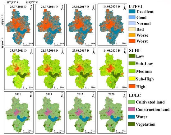 Images of UTFVI, SUHI, and LULC for 2011, 2014, 2017, and 2020.