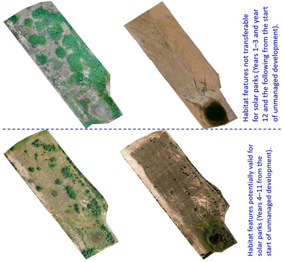 Solar parks tend to be organized in a more complicated way than the ‘group 1’ years of development in the Hühnerwasser catchment area. Solar parks are likely to provide significant and more stable support for bird species classified in groups 2 and 3. The reasons for this can be intuitively guessed from the appearance of the area (Figure 1 and Figure 2) and traced through the chronological sequence presented in Table S1, drawing on overlaps with botany, and some explanation of zoology beyond birds in the text.