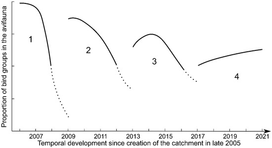 Consideration of the entire Hühnerwasser timeline (Table S1) shows both clear successional changes in avian species [47] and an ever-present intrinsic conservation value of the dynamic landscape of the Hühnerwasser catchment for birds. The four different bird groups distinguish themselves quite plausibly, clearly, and distinctly from each other. The successive replacement of such groups in wildlife populations appears to be a strong pattern coupled with ongoing progressive vegetation dynamics, i.e., primary succession, in the Hühnerwasser catchment area (see [12,48] for comparison). This also means that only 16 years after the creation of the catchment, the species of the first groups have largely disappeared. Thus, at the highest level of Pickett et al.’s (1987, [4]) hierarchy of succession, ‘differential species performance’ is clearly present in our 16-year time series; the four groups and their sequence are likely to be readily transferable to many other systems.