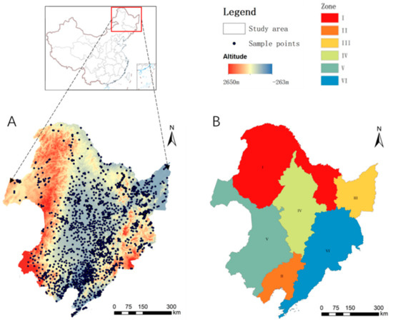 Study area. (A) Location of sampling points in the black soil region. (B) Distribution of the black soil region partitions; partitions were mainly based on soil types.