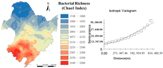 Spatial distribution of the Chao1 index in the black soil area. The colors indicate the extrapolated values expressed as Chao1 per soil sample. In the graph, the points represent the experimental variogram and the continuous lines are the Gaussian models fitted by GS+.
