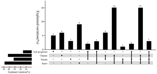 We used the “Vegan” package to estimate the effects of soil physicochemical parameters, climatic conditions, terrain, and spatial effects on soil bacterial abundance through variance partitioning. First, the environmental variables were grouped. The groupings were divided as follows: AT and MAP indicators into climate; altitude and slope into the terrain; the remaining pH, SOM, and other indicators into soil property; the selected dbMEM variables into space descriptors. Then, the intra- and inter-group explanation rates were calculated and forward and backward selections were performed to screen out the significant environmental variables involved in the variation partition [33]. Finally, the “ggplot2” package was used to map in R.