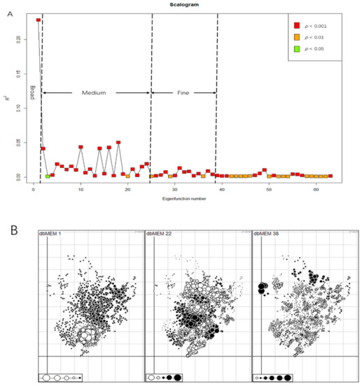 In this work, dbMEM analysis was performed using the “adespatial” package and a total of 907 dbMEMs were fitted [34]. Forward selection was performed on all dbMEMs to obtain 63 significant dbMEMs, which were further screened (27) and divided according to R2. For the three spatial scales (broad, medium, and fine), the dbMEM with the highest R2 was selected from each scale to participate in the variance partition.
