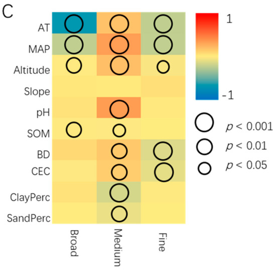We performed spatial effect fitting according to the study area and a total of 27 significant dbMEMs were fitted, shown in Figure 6A, each representing a different spatial scale (broad: 148~222 km, medium: 74~148 km, fine: 30~74 km, Table 2). We screened the most significant dbMEM for R2, shown in Figure 6B, involved in the variation partitioning at each scale. The order of interpretation of dbMEM at different scales was as follows: broad (8.336%) > medium (0.443%) > fine (0.368%). The Pearson correlation coefficient also showed the same trend of broad (r = 0.673, p < 0.05) > medium (r = 0.128, p < 0.05) > fine (r = 0.059). The analysis results of the influencing factors at different scales showed the following: the broad scale was more correlated with AT, MAP, and altitude indicators (p < 0.01); the medium was correlated with other indicators except for slope (p < 0.05); the fine was correlated with BD, CEC, AT, and MAP (p < 0.05). The results are shown in Figure 6C.