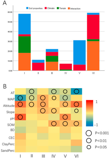Analysis of bacterial abundance in partitions. (A) Variation partition of partitions, which includes soil properties, climate, terrain, and interaction. (B) Pearson coefficient of partitions; colors indicate the value of the Pearson coefficient and the circles indicate the confidence level. I, the black and dark brown soil areas in the low foothills of the Xiaoxing’an Mountains. II, the brown and black soil area in the Liaohe Plain. III, the white mud soil area in the Sanjiang Plain. IV, the black soil calcareous region of Songnen Plain. V, the western semi-arid area. VI, the dark brown soil area in low hilly area of Changbai Mountain.