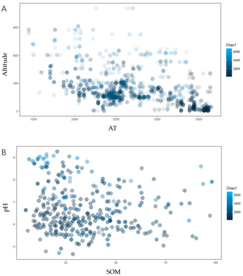 Comparison of the distribution of soil bacterial abundance under the conditions of altitude and accumulated temperature (A), and pH and soil organic matter (B). The darker the color of bubbles, the higher the Chao1 index. (A) Altitude (m), AT (°C); (B) SOM (g/kg).