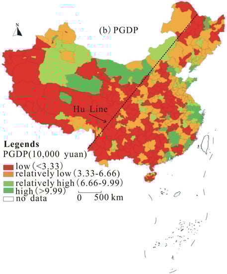 Unlike Figure 1a, Figure 1b shows that the spatial divergence of the PGDP of municipal units in the Chinese mainland in 2015 was not noticeable on the northwest Chinese mainland and southeast Chinese mainland of the Hu Line. Areas with a higher PGDP were mainly located in the relatively developed eastern coastal regions, including the central-southern Liaoning urban agglomeration, Beijing–Tianjin–Hebei urban agglomeration, urban agglomeration on the Shandong Peninsula, Yangtze River Delta urban agglomeration, Southeastern Fujian urban agglomeration, and Pearl River Delta urban agglomeration. The comparative advantages of economic well-being per capita in most of the above regions were high (PGDP: above 99,900 yuan) or relatively high (PGDP: 66,600–99,900 yuan), whereas in the central and western regions, the comparative advantages of economic well-being per capita in municipal units were low (PGDP: <33,300 yuan) or relatively low (PGDP: 33,300–66,600 yuan).